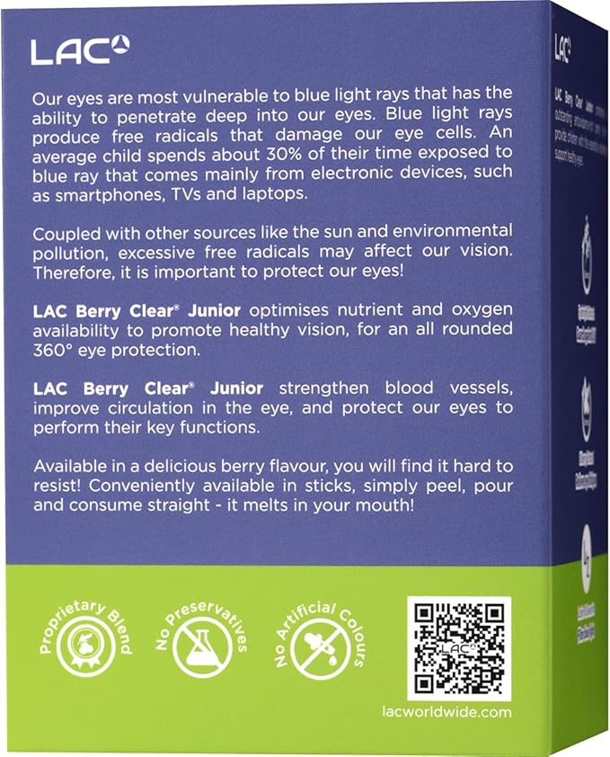 Introducing LAC Berry Clear® Junior For Healthy Eyes. An antioxidant-rich berry powder filled with essential nutrients to maintain healthy eyesight!