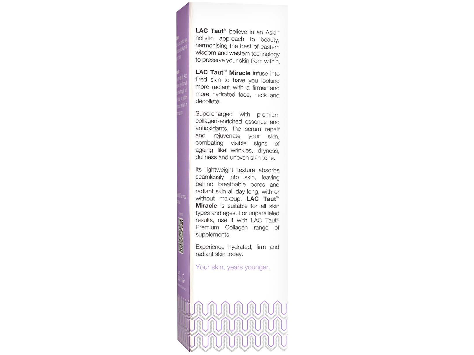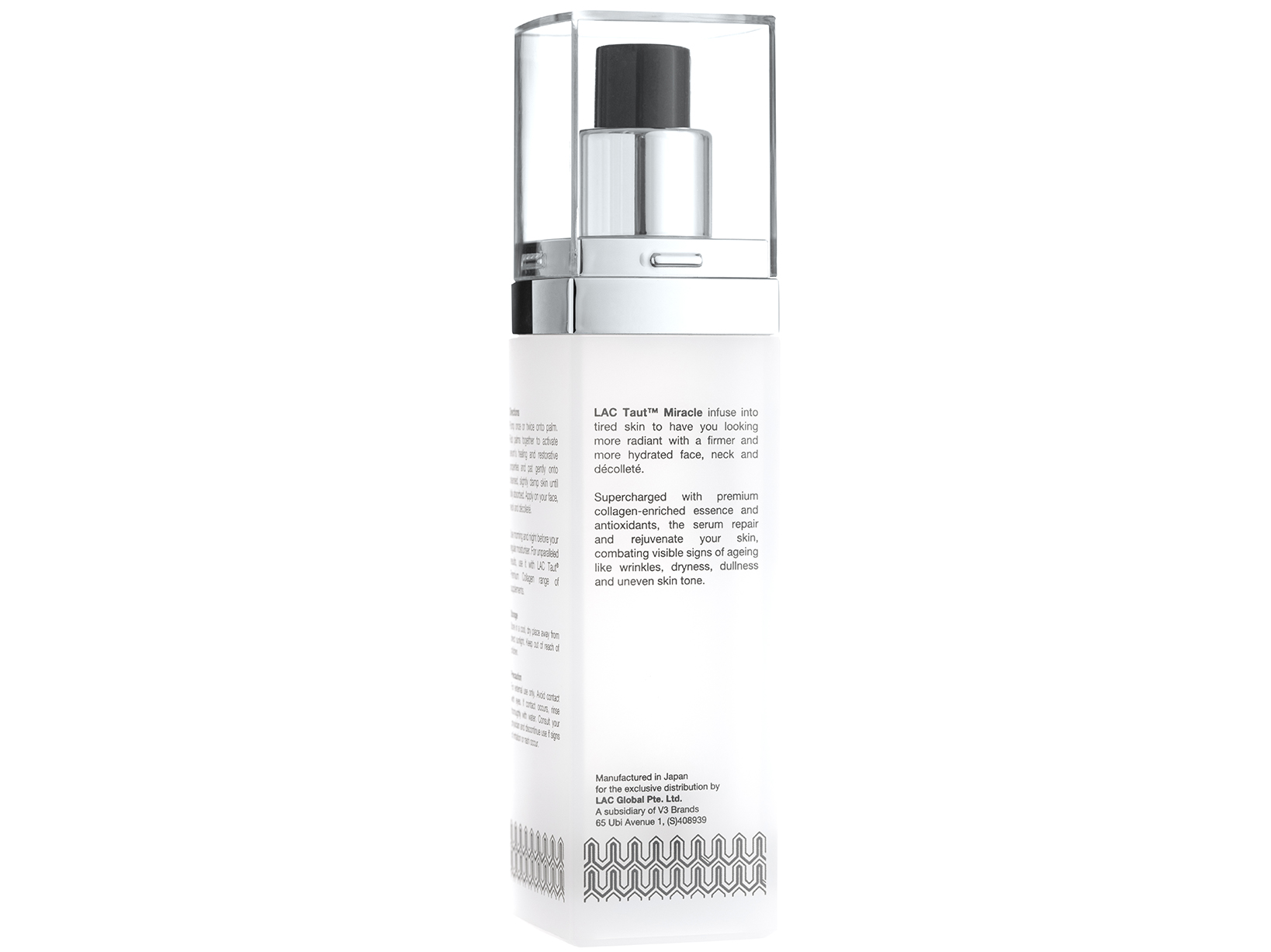 LAC Taut® Miracle is a luxurious face serum enriched with premium collagen-enriched essence and antioxidants. This miracle serum is designed to intensively hydrate, repair damaged skin barrier, and diminish the appearance of fine lines and wrinkles for a more youthful look. Featuring an ultra-lightweight texture, it effortlessly glides onto the skin, absorbs quickly and penetrates deep into the layers of your skin without leaving any sticky residue or clogging pores.