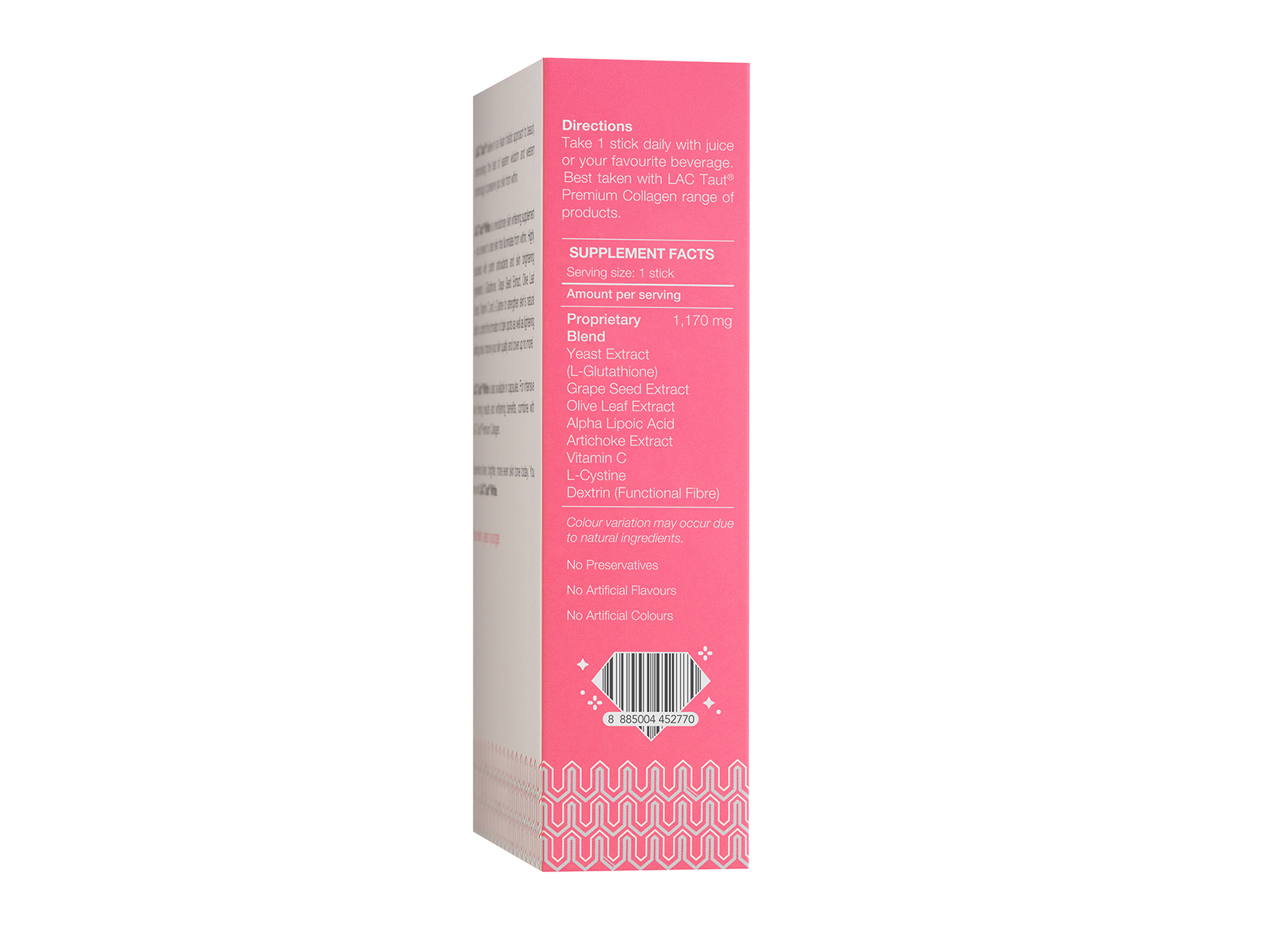 Direction of UseTake 1 stick daily with juice or your favourite beverage. Best taken with LAC Taut® Premium Collagen range of products.